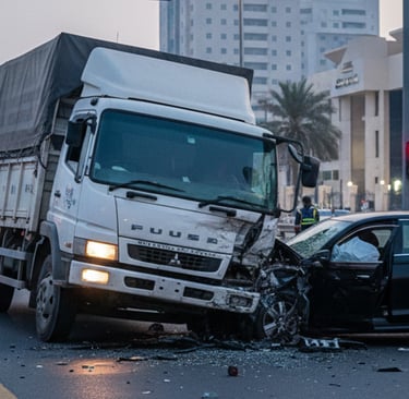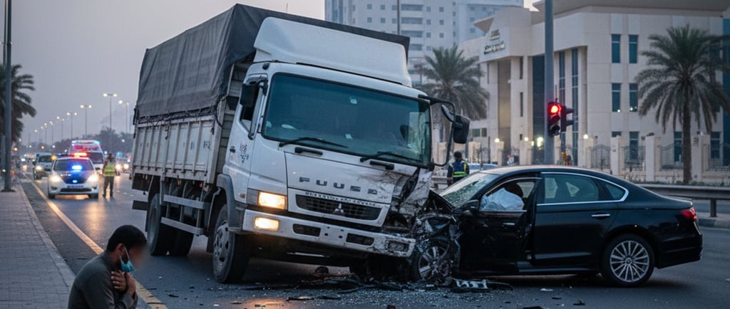 The accident occurred on June 23, 2023, on the Al Jurf - Sheikh Zayed Road in Ajman, opposite the Al Hamidiya Police Station. An Indian driver of a Mitsubishi Fuso vehicle, coming from Al Hamidiya Street, ran a red light and collided with another vehicle traveling on Sheikh Zayed Street.