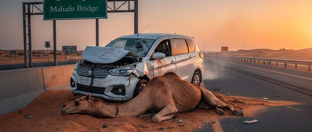 The accident occurred on June 1, 2024, near the Mahafir Bridge on the Sharjah-Mleiha Road. Sajid was driving a Suzuki Ertiga when he collided with a camel that had wandered onto the road. The impact was fatal for the animal, and Sajid sustained severe injuries to his head, spine, and left hand. He was immediately rushed to Al Dhaid Hospital for emergency treatment.